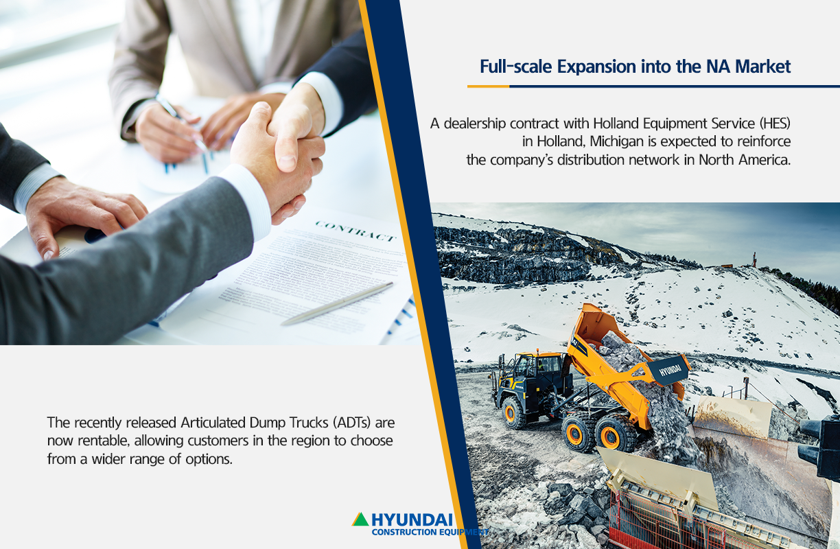 Continuing the momentum, HCE plans to expand further its business network in the region to take the upper hand in the developed North American market. One example of such a plan is a dealership contract with Holland Equipment Service (HES), a representative construction equipment supplier in Michigan. Through this contract, HCE will be able to provide its products and service in southwestern Michigan, including its wheel loaders and excavators. The Articulated Dump Truck (ADT) the company released this June will also be available for rent, allowing a broader option for North American customers.
