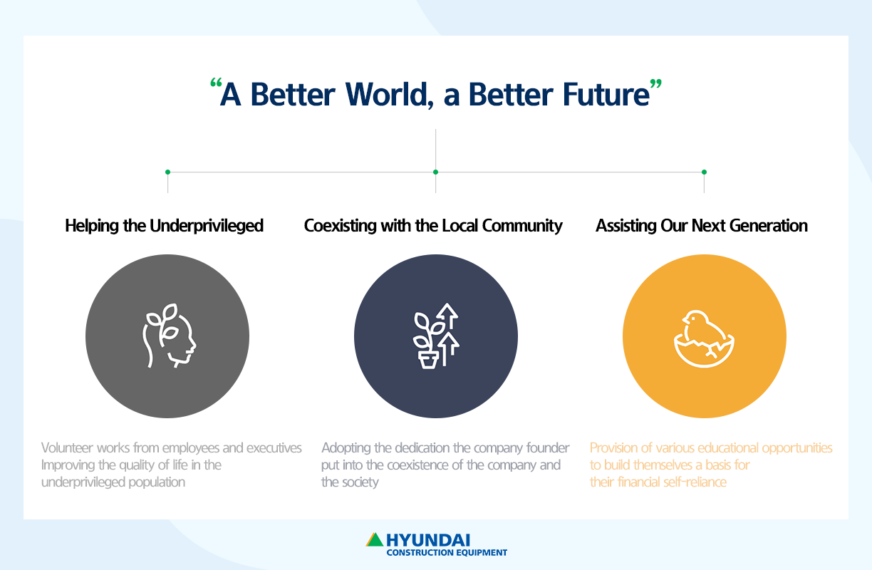 In 2019, Hyundai Construction Equipment came up with a new vision for our social contribution efforts, “A better world, a better future.” To make our society a better place to live, HCE is putting efforts into taking care of the underprivileged people in our society, vitalizing the local economy, and educating the younger generation who will lead our future society.
