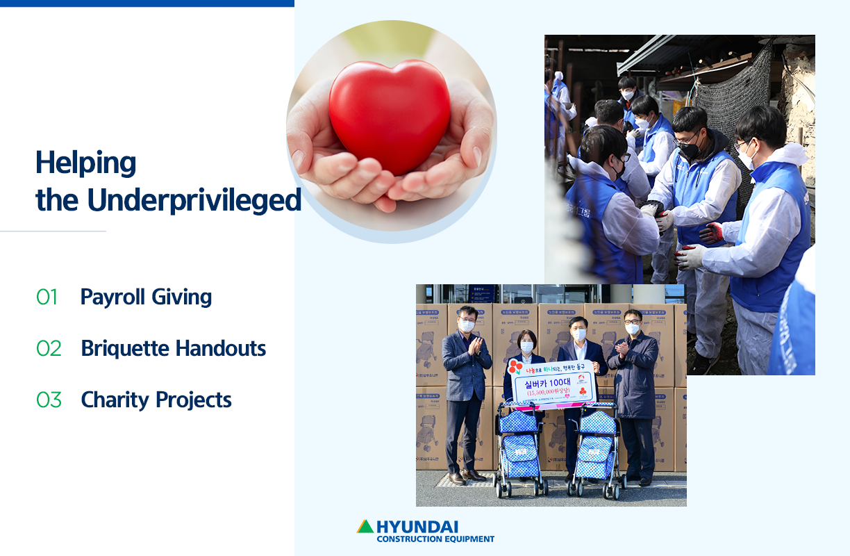 The future of a company depends on whether it fulfills its social obligations and responsibilities. Hyundai Construction Equipment recognizes its social responsibilities and hopes to contribute to the improvement of the country and local communities as a global corporation. We will continue to fulfill our responsibilities by showing our love and care to our neighbors and sharing what we have earned with the community. HCE believes in the power of good, the power of benevolence.