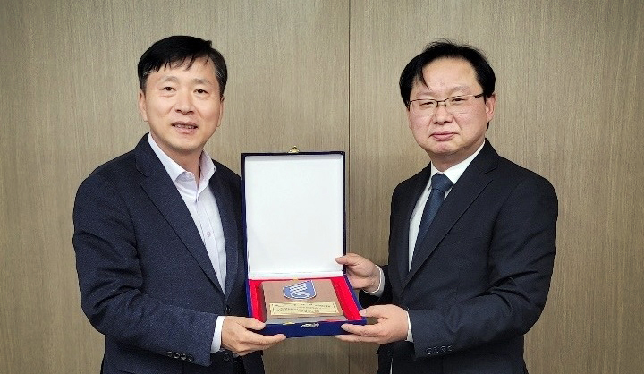 21일(금), 현대건설기계 HR/지원부문장 박호석 상무(왼쪽)가 국가보훈처에서 실시한 감사패 전달식에 참가하고 있다.