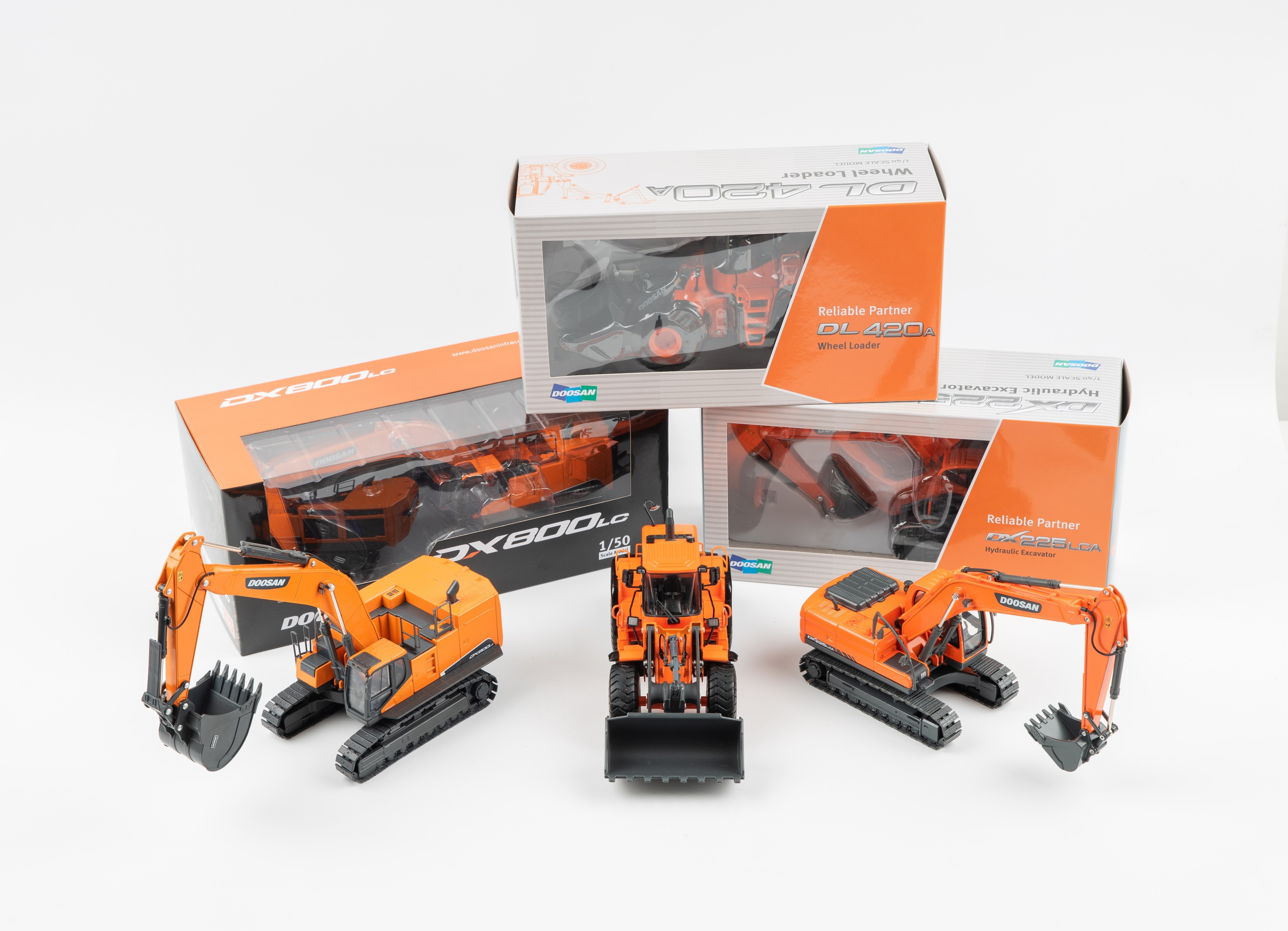 이번에 판매하는 건설기계 미니어처는 두산인프라코어 건설기계 제품을 그대로 축소, 구현한 전시용 모형이다. 최근 한국시장에 출시한 80톤 초대형 굴착기 DX800LC와 중형 굴착기 DX225LCA, 휠로더 DL420A까지 3가지 종류다.