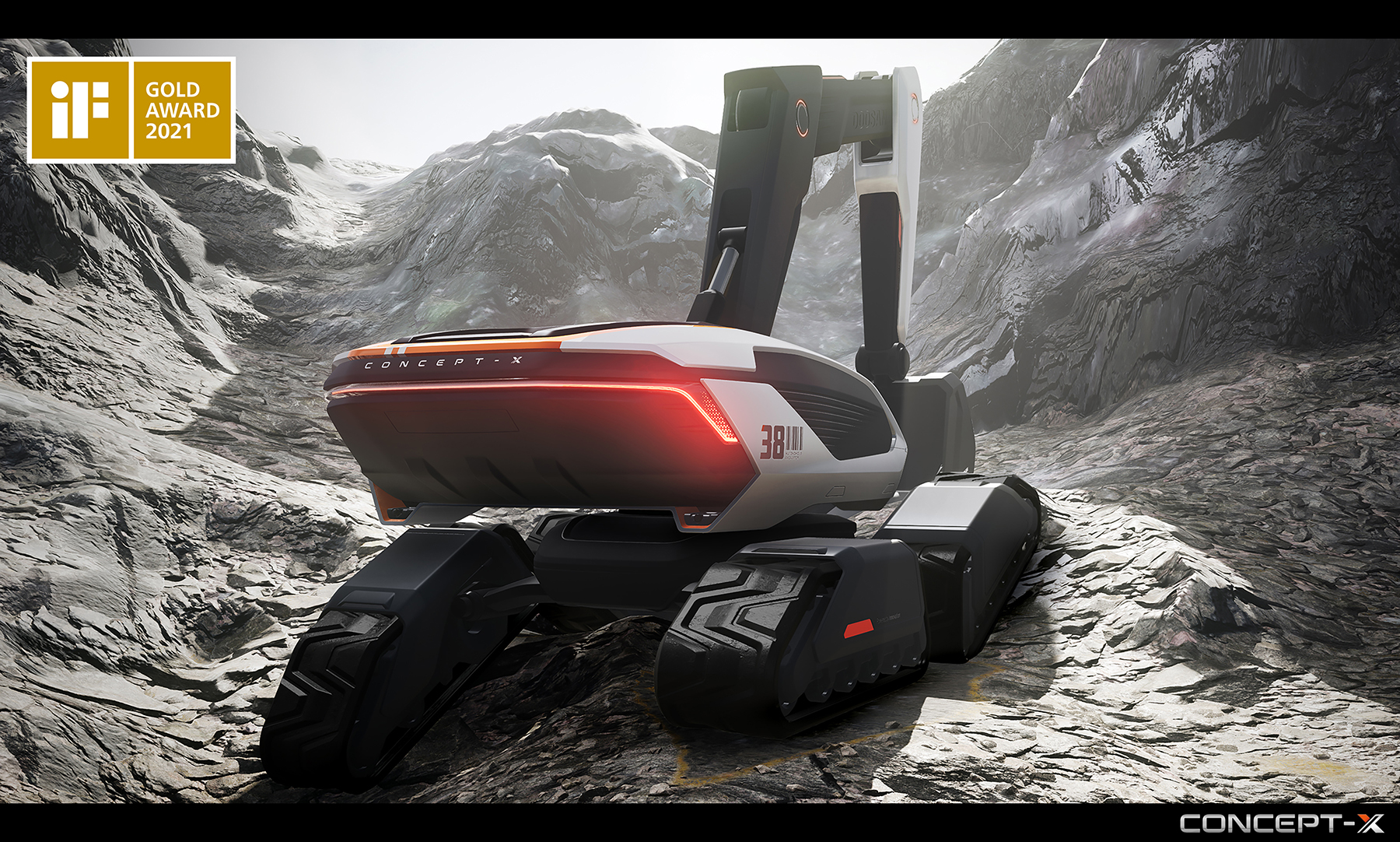 두산인프라코어가 출품한 ‘콘셉트엑스 굴착기’는 미래형 무인 건설장비로 운전자가 탑승하는 캐빈이 없는 디자인과 하부체인 굴착기 무한궤도가 4개로 분리된 것이 특징이다. 4개의 무한궤도는 고르지 않은 지면에서도 안정적인 자세를 유지하는데 유리하다. 사람의 팔에 해당하는 굴착기 붐을 제외한 각 구동부분이 전동화 되었고, 결합부위에 원형 인디케이터가 장착돼 쉽게 부하를 인지할 수 있도록 디자인됐다.