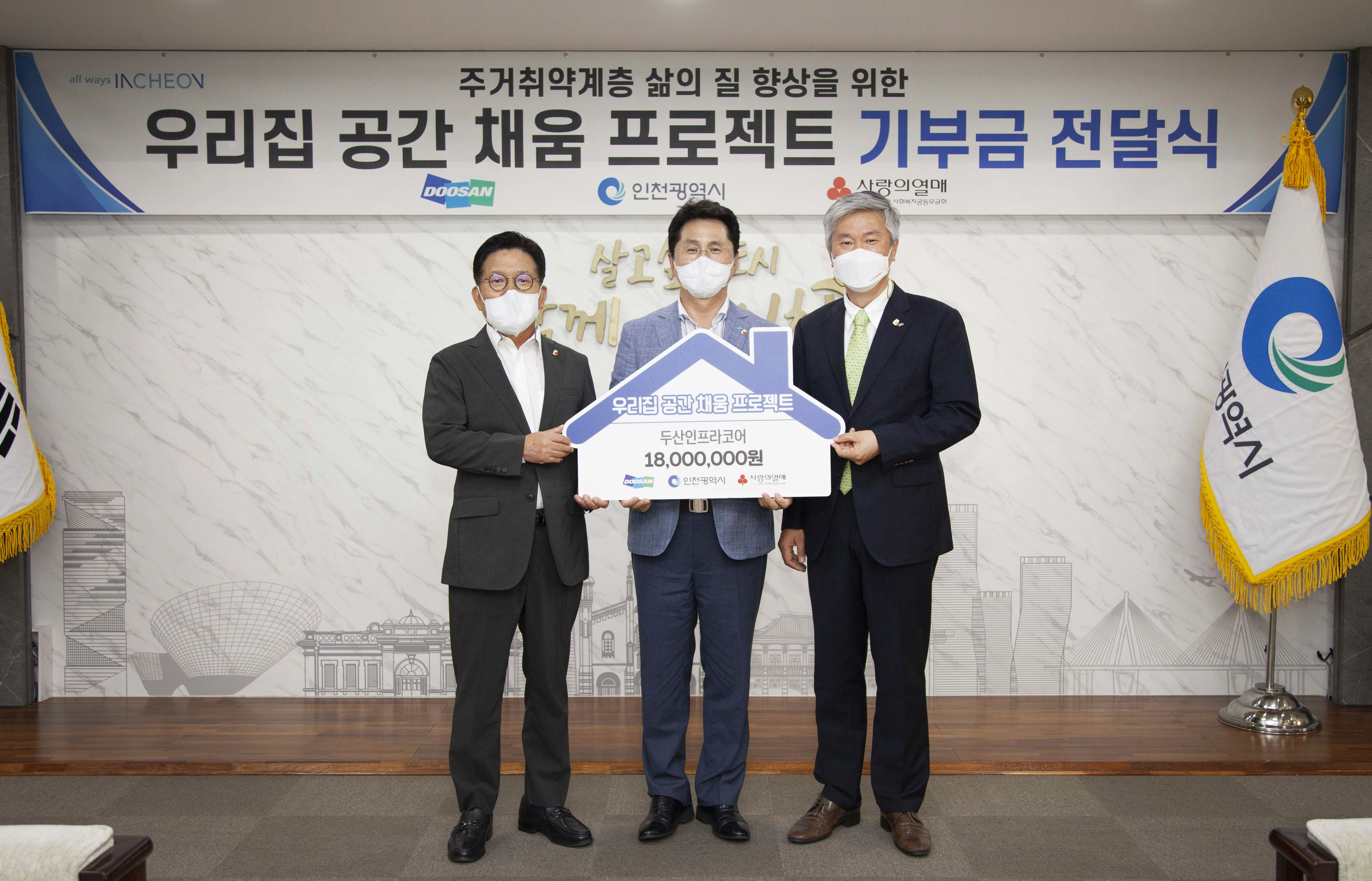 두산인프라코어는 인천시청에서 인천시 조택상 정무부시장, 인천사회복지공동모금회 조상범 회장, 두산인프라코어 박성권 전무가 참석한 가운데, 인천형 영구임대주택 지원 프로그램인 ‘우리집 공간 채움 프로젝트’에 참여해 기부금 전달식을 가졌다고 1일 밝혔다.