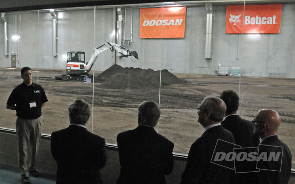회사 관계자들이 밥캣 Acceleration Center내 신규 장비 시험장에서 시험과정을 지켜보고 있다